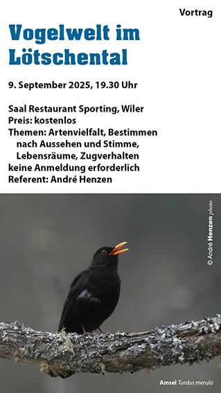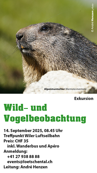 Vorträge, Exkursionen und Kurse Herbst 202509.09.2025 19.30 Uhr: Vogelwelt im Lötschental, Vortrag: Artenvielfalt, Bestimmen nach Aussehen und Stimme, Lebensräume, Zugverhalten. Ort: Hotel-Restaurant Sporting, 3918 Wiler. Preis: kostenlos. 14.09.2025 08.45 Uhr: Wild- und Vogelbeobachtung, Exkursion Lauchernalp-Kummenalp. Treffpunkt: Luftseilbahn-Talstation, 3918 Wiler. Preis: CHF 35/Person. Anmeldung: events@loetschental.ch. 26.10.2025 09.30 Uhr: Wetter und Orientierung im Gebirge, Weiterbildungskurs für Bergführer. Ort: Hotel-Restaurant Sporting, 3918 Wiler: Preis: CHF 150, kostenlos für Mitglieder Sektion Rhonetal. 30.12.2025 14.00 Uhr: Vogelwelt im UNESCO-Welterbe Schweizer Alpen, Jungfrau-Aletsch, Vortrag für Hotelgäste. Ort: Grimsel Hospiz, 3919 Guttannen. Preis: kostenlos, nur für Hotelgäste.