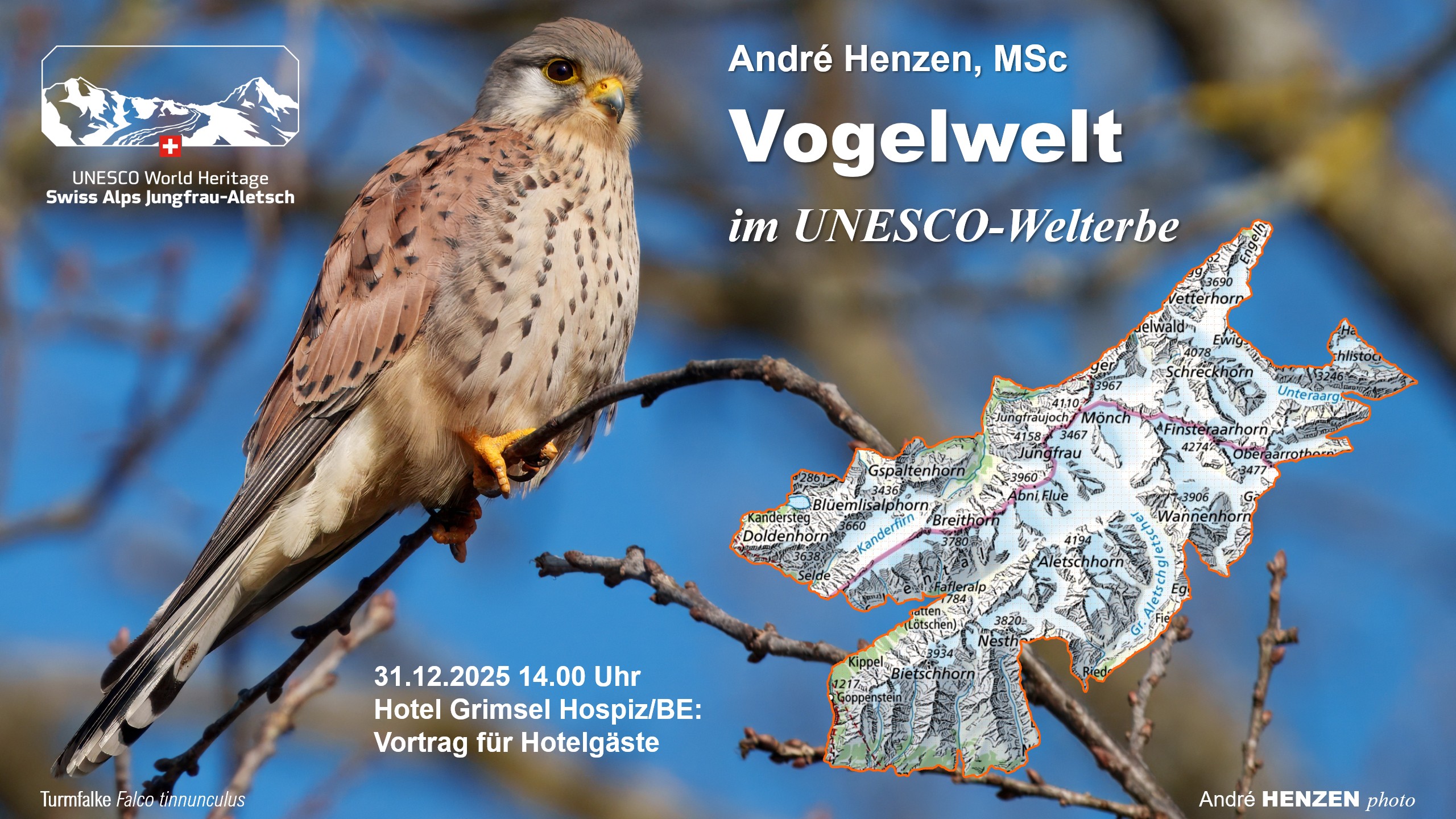 Vorträge, Exkursionen und Kurse Herbst 202509.09.2025 19.30 Uhr: Vogelwelt im Lötschental, Vortrag: Artenvielfalt, Bestimmen nach Aussehen und Stimme, Lebensräume, Zugverhalten. Ort: Hotel-Restaurant Sporting, 3918 Wiler. Preis: kostenlos. 14.09.2025 08.45 Uhr: Wild- und Vogelbeobachtung, Exkursion Lauchernalp-Kummenalp. Treffpunkt: Luftseilbahn-Talstation, 3918 Wiler. Preis: CHF 35/Person. Anmeldung: events@loetschental.ch. 26.10.2025 09.30 Uhr: Wetter und Orientierung im Gebirge, Weiterbildungskurs für Bergführer. Ort: Hotel-Restaurant Sporting, 3918 Wiler: Preis: CHF 150, kostenlos für Mitglieder Sektion Rhonetal. 30.12.2025 14.00 Uhr: Vogelwelt im UNESCO-Welterbe Schweizer Alpen, Jungfrau-Aletsch, Vortrag für Hotelgäste. Ort: Grimsel Hospiz, 3919 Guttannen. Preis: kostenlos, nur für Hotelgäste.